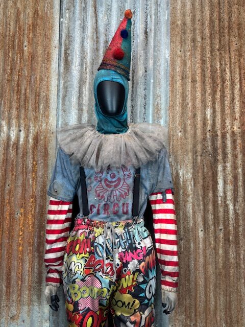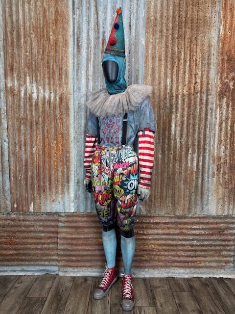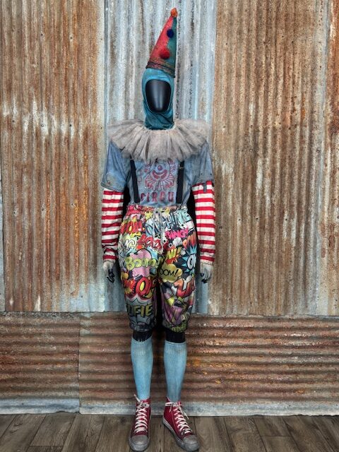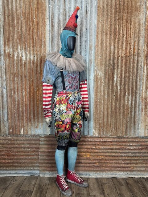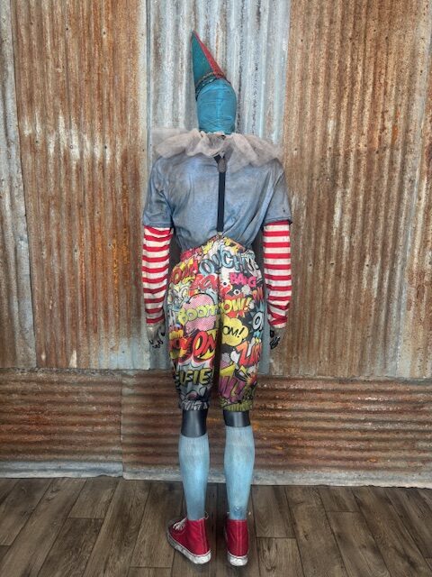 Each costume arrives fully built and performance-ready, featuring a complete clown ensemble professionally aged and distressed in-house, including shoes, knicker pants, arm sleeves, gloves, suspenders, T-shirt, neck ruffle, full face mask, and cone hat. Available in Medium through 2XL.