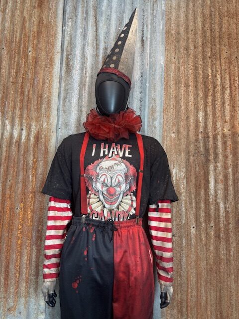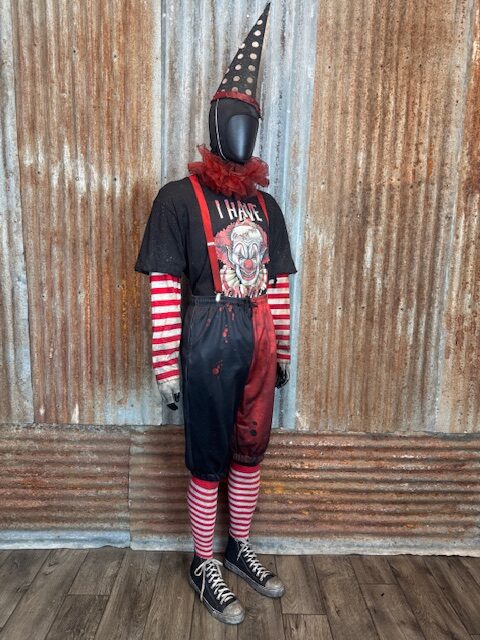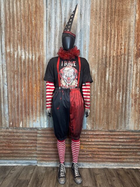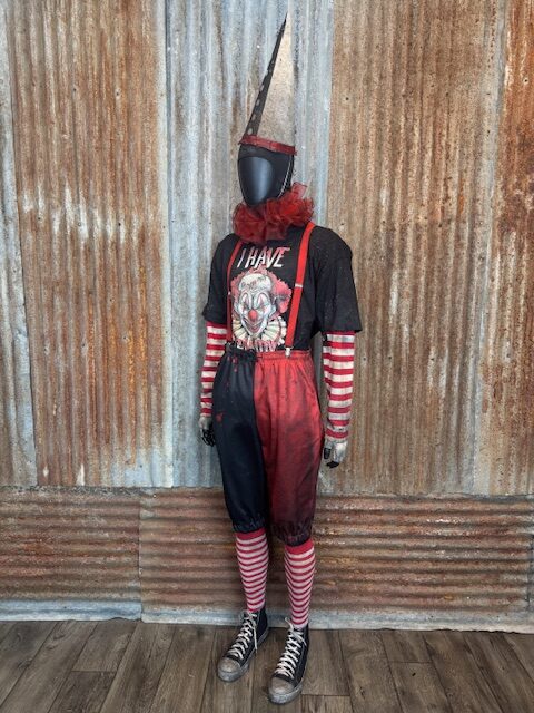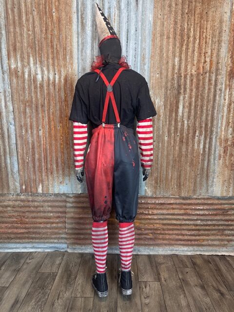 Each costume arrives fully built and performance-ready, featuring a complete clown ensemble professionally aged and distressed in-house, including shoes, knicker pants, arm sleeves, gloves, suspenders, T-shirt, neck ruffle, full face mask, and cone hat. Available in Medium through 2XL.