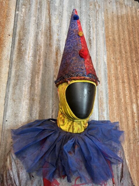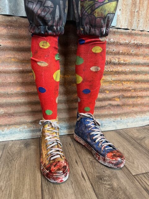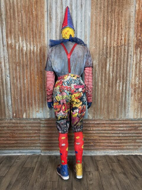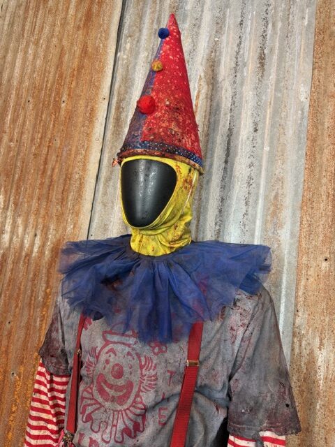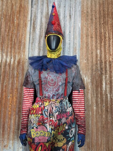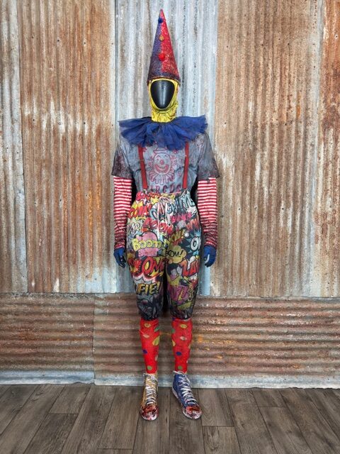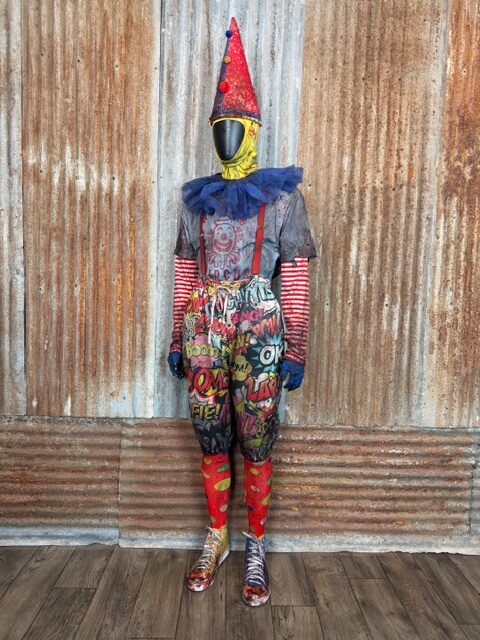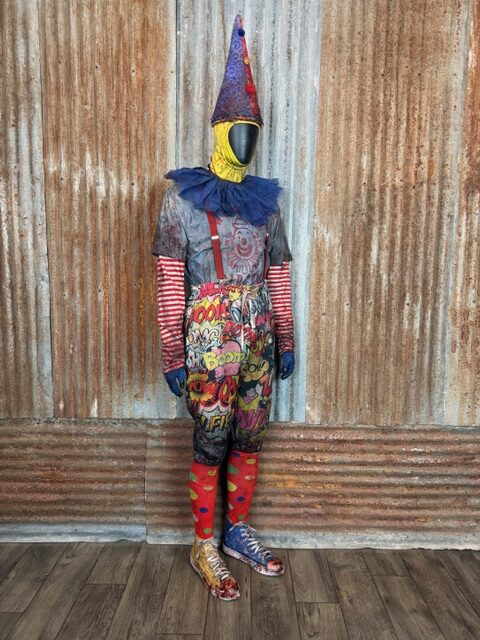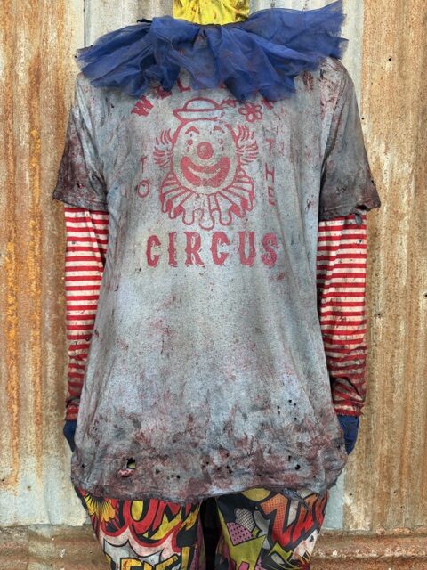 This custom Giggle Gang is a one of a kind Size XL ready to ship. It comes complete with custom distressed and aged bloody pants, shirt, suspenders, socks, shoes (size 11.5-12), gloves, arm bands/undershirt, neck ruffle, lycra face mask and custom cone hat.