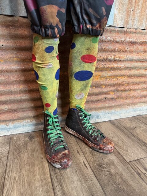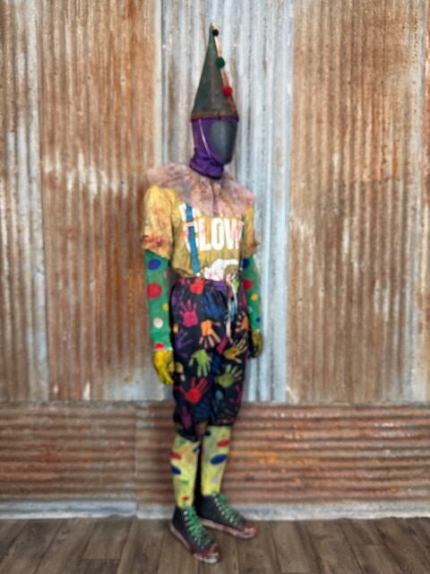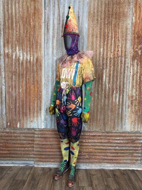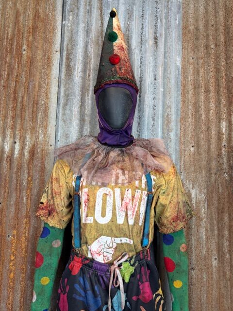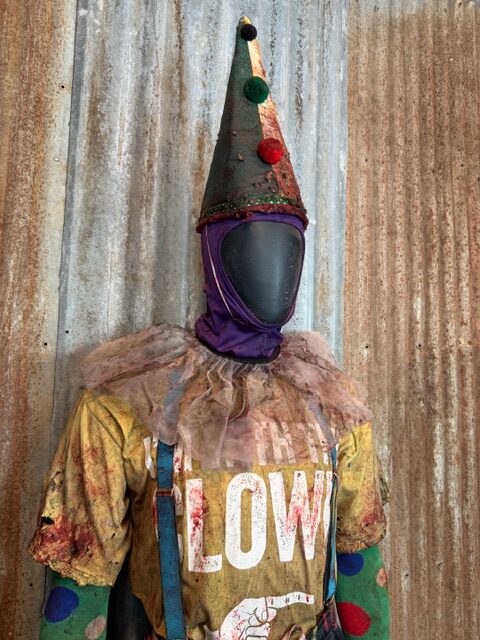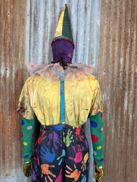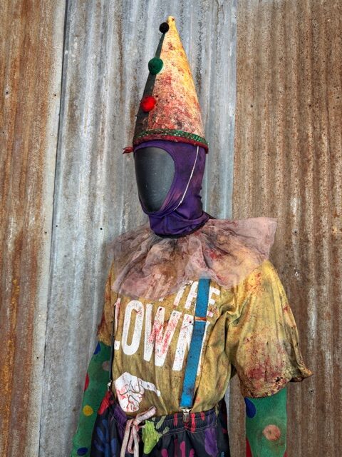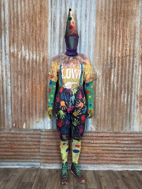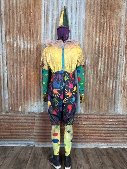 This custom Giggle Gang is a one of a kind Size XL ready to ship. It comes complete with custom distressed and aged bloody pants, shirt, suspenders, socks, shoes (size 11.5-12), gloves, arm bands/undershirt, neck ruffle, lycra face mask and custom cone hat.