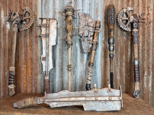 Forged from ruin and built for survival, the Wasteland Armory collection embodies brutal, post-collapse craftsmanship. Each piece is constructed from high-density professional-grade materials with layered Worbla, resin hardware, distressed wraps, and industrial detailing to replicate salvaged steel and scrap-forged weaponry. Meticulous layered painting and advanced rust texturing create a realistic, camera-ready finish while remaining lightweight and performance safe—designed for film, haunt, and high-impact character work.